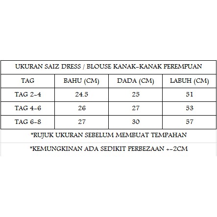 Butik design no 2 jalan putera . Baju kurung johor ukuran/saiz 2 4 6 8 10 bahu 10 11 12 12.5 13 labuh tangan 11.5 13 14.5 15.5 17 labuh baju 19.5 23 25.5 27 30 dada 28 30 31 32 34 . Lingkar pinggang, 68 cm, 72 cm, 76 cm . Lingkar badan, 88 cm, 96 cm, 100 cm, 104 cm ; Kadang kala adalah amat sukar bagi yang pertama kali ingin membeli baju atau blouse secara online untuk menetukan saiz yang tepat. 2l 3l 4l 5l baju gamis jumbo dress big size baju gamis wanita over size.